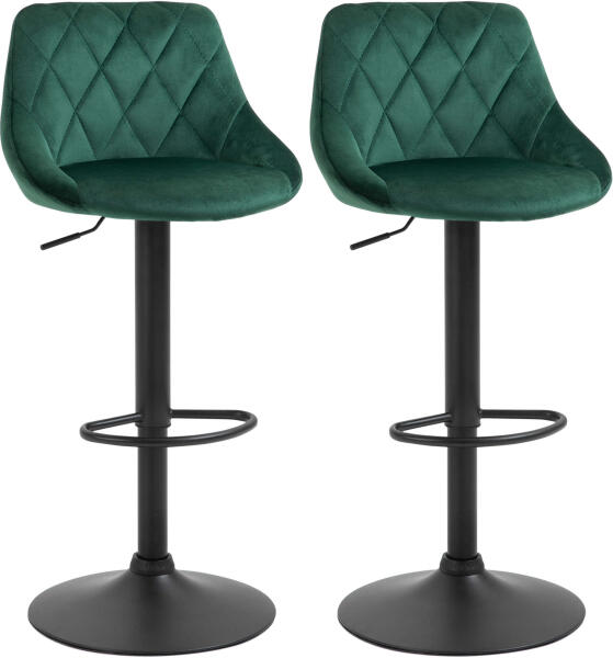 2 db elegáns, zöld bársony bárószék állítható magassággal Kényeztesse magát és vendégeit ezzel a 2 db-os elegáns bárószék készlettel! A bársony kárpitozás és a gyémánt steppelt minta luxus érzetet kölcsönöz a széknek, miközben a fekete fém talp modern megjelenést biztosít. Az állítható magasságnak köszönhetően bármilyen magasságú bárpulthoz tökéletesen illeszkedik. A 360°-ban forgó funkció pedig extra kényelmet nyújt. Főbb jellemzők:Elegáns zöld bársony kárpitozás: Puha, kényelmes és könnyen tisztítható. Gyémánt steppelt minta: Modern és stílusos megjelenés. Állítható magasság: 83-104 cm között állítható, így bármilyen bárpulthoz illeszkedik. 360°-ban forgó: Könnyű elfordulás és kényelmes használat. Robusztus fém talp: Stabil és biztonságos tartást biztosít. Csúszásgátló lábak: Védik a padlót a karcolásoktól. Kényelmes lábtámasz: Optimális lábtartásért. Teherbírás: 120 kg Méretek:Méret Méret (cm)Teljes magasság 83-104Ülés magasság 60-81Ülés szélesség 51,5Ülés mélység 36Alap átmérő 41Összeszerelés szükséges.
