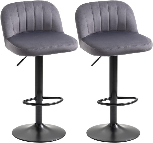 HOMCOM Állítható Magasságú Bárszék Szett (2 db) - Stílus és Kényelem Egyben! ? Dobd fel otthonod vagy bárod hangulatát ezzel a modern és elegáns bárszék szettel! A HOMCOM bárszékek nem csak jól néznek ki, de kényelmesek és praktikusak is. Főbb Jellemzők:Kényelmes bársony kárpitozás: Puha és kellemes tapintású, így a hosszas üldögélés sem okoz problémát. 360°-ban forgatható ülés: Könnyedén válthatsz irányt, anélkül, hogy fel kellene állnod. ? Állítható magasság: A szék magassága igényeidhez igazítható, így tökéletesen illeszkedik a bárhoz vagy pulthoz. ⬆️⬇️ Stabil acél talp: A széles talp biztosítja a stabilitást, a csúszásgátló lábak pedig megakadályozzák a padló karcolódását. Lábtartó: Kényelmesen pihentetheted a lábad. Műszaki adatok:Jellemző ÉrtékSzín Szürke, FeketeAnyag Poliészter, Acél, HabszivacsTeljes méret 43 x 45 x 81-101cmÜlésmagasság 61-81cmHáttámla mérete 42 x 4 x 21cmLábtartó magasság 20-40cmAlap mérete Ø38cmTeherbírás 120kgA csomag tartalma: 2 db bárszék 1 db használati útmutató Ezek a bárszékek nem csak stílusosak, de rendkívül praktikusak is. Tökéletes választás otthonra, bárokba vagy akár éttermekbe is. Élvezd a kényelmet és a modern dizájnt a HOMCOM bárszékekkel! ✨