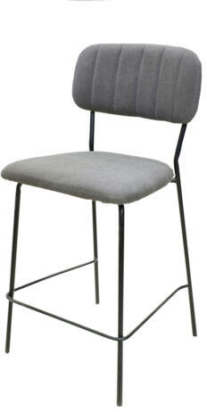 Fix magasságú, lábtartóval ellátott bárszék. Fekete színű fém vázzal és szürke textil kárpitozással.