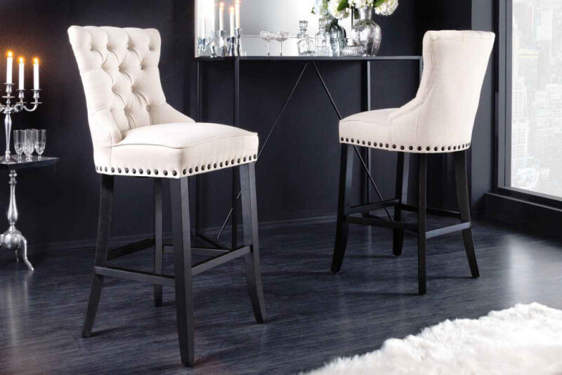 A Queen bárszék tetszetős dizájnja a háttámla belső oldalán található Chesterfield-stílusú dekoratív varrások eredménye, amelyek magas ülési kényelmet biztosítanak. Az ergonómikusan kialakított ülés kellemes támasztást nyújt a hátnak és kényelmes üléspozíciót kínál. A bézs borítás fényűző benyomást kelt. A fekete fa lábak biztonságot nyújtanak minden felületen. A praktikus lábtartóval kellemesebb lesz az ülés. Kialakításának köszönhetően a szék univerzálisan használható, könnyen kombinálható klasszikus és modern stílusú bútorokkal. Rendkívül harmonikus koncepciót alkothat, ha ugyanazon sorozat kiegészítőivel kombinálja. A stílusos Queen bárszék egy otthoni bárt és egy stílusosan berendezett kávézót díszít majd.